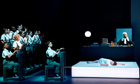 Somehow, too, Wilson's abstract inventions have lost a lot of their visual magic: a narrow rectangle of light slowly rotating from the horizontal to the vertical to the accompaniment of Glass's churning patterns isn't quite the iconic image it once was. On the opening night, as well, backstage technical problems added to that sense of dated clunkiness. The performance began half an hour late, and an unscheduled interval had to be inserted after the first act, when one tower refused to move on and off stage as expected. Wilson himself then appeared to explain the problems and to announce that the final scene would not include the flying figures it should.