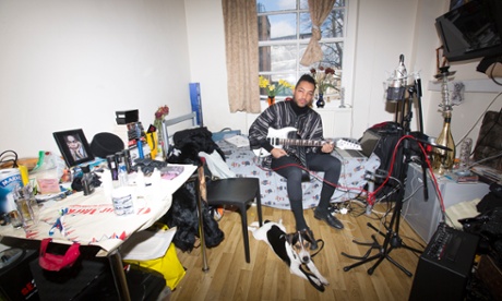 Usman Uzzee, 21, is a fashion design student at the London College of Fashion. “I decided to start playing guitar because of my obsession with Metallica, and have been into rock since I was about four or five. My mum [who is in the photograph on his desk] influenced me too. She took me to a concert in Birmingham to watch Steely Dan.” He got his Jack Russell about a year ago for £80: “I think he was literally the best bargain I’ve ever got.” Photograph: Graeme Robertson for the Guardian Photograph: Graeme Robertson