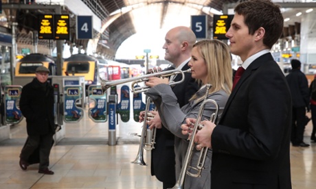 The competition was launched with a performance led by Alison Balsom, centre, at Paddington station. Photograph: Jeff Moore