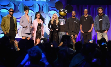Musicians such as Madonna and Rihanna on stage at the Tidal launch event with Jay Z in New York. Photograph: Jamie McCarthy